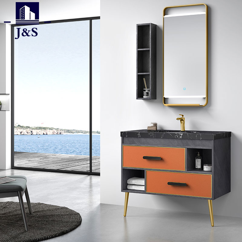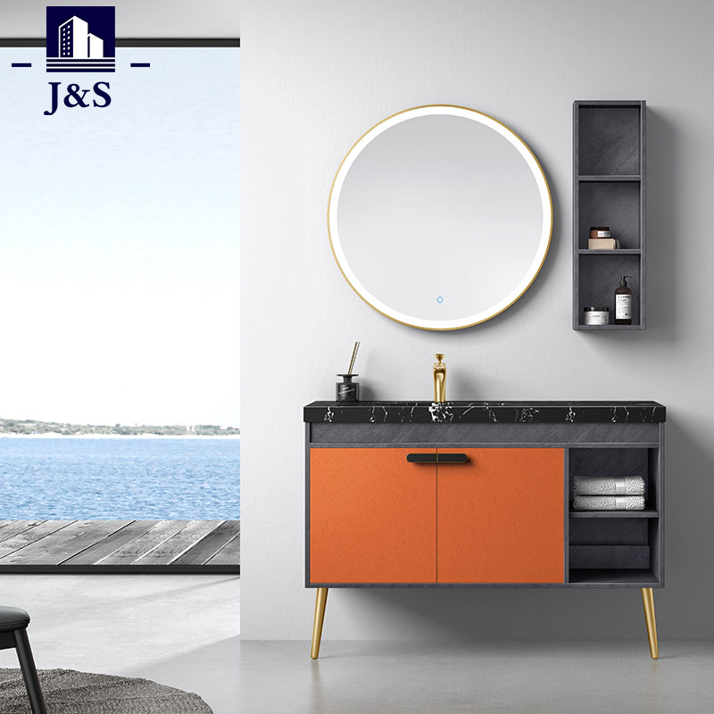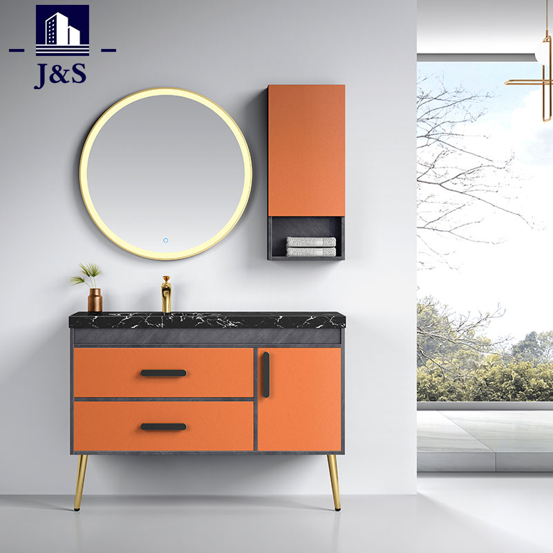Toimitamme lattialla seisovan kylpyhuonekaapin. Tämä on oranssin värinen kylpyhuoneen turhamaisuus kultaisella kahvalla, erottuva ja muodikas.