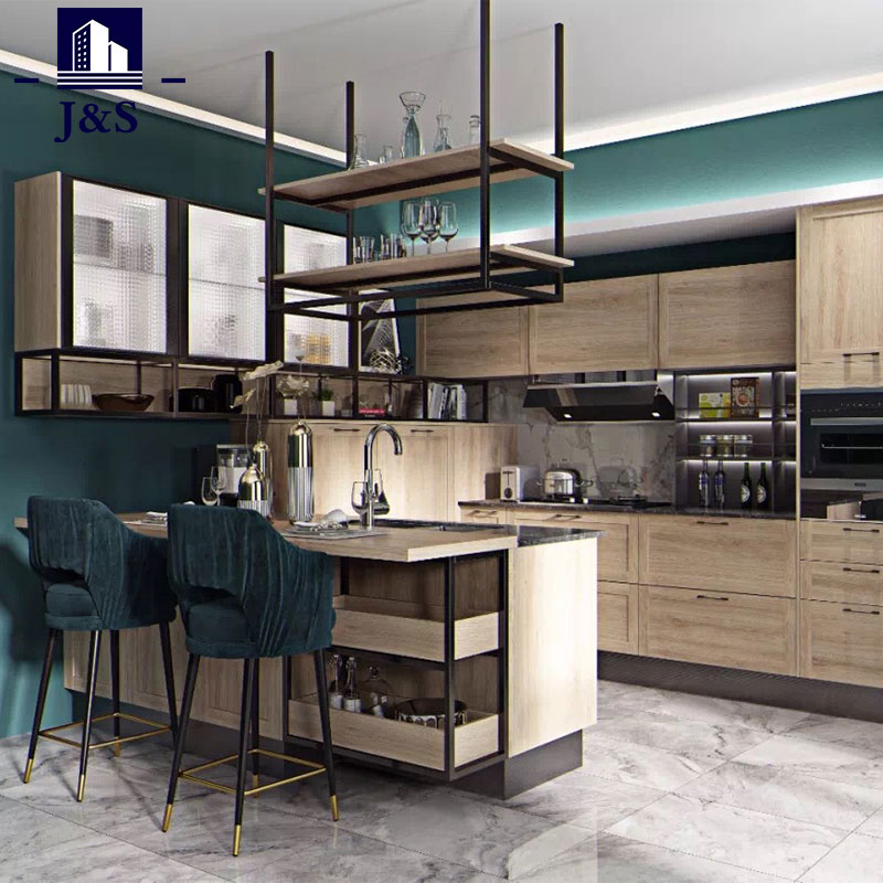 J&S HOUSEHOLD on yritys, joka on sitoutunut tarjoamaan asiakkaille räätälöityjä ratkaisuja heidän luksuskeittiönsä suunnitteluun. Tarjoamme luksuskeittiösuunnittelun suunnittelua ja muuntamista. Tässä setissä on avokeittiö, johon on integroitu karkaistu lasiseinäkaapin ovet, puuviiluruokavarasto ja ruskea maalisaarekepohja. Kirkkaat lasihyllyt LEDillä tekevät kaapista lämpimämmän ja häikäisevän luoden ylellisen ja huippuluokan tekstuurin.
